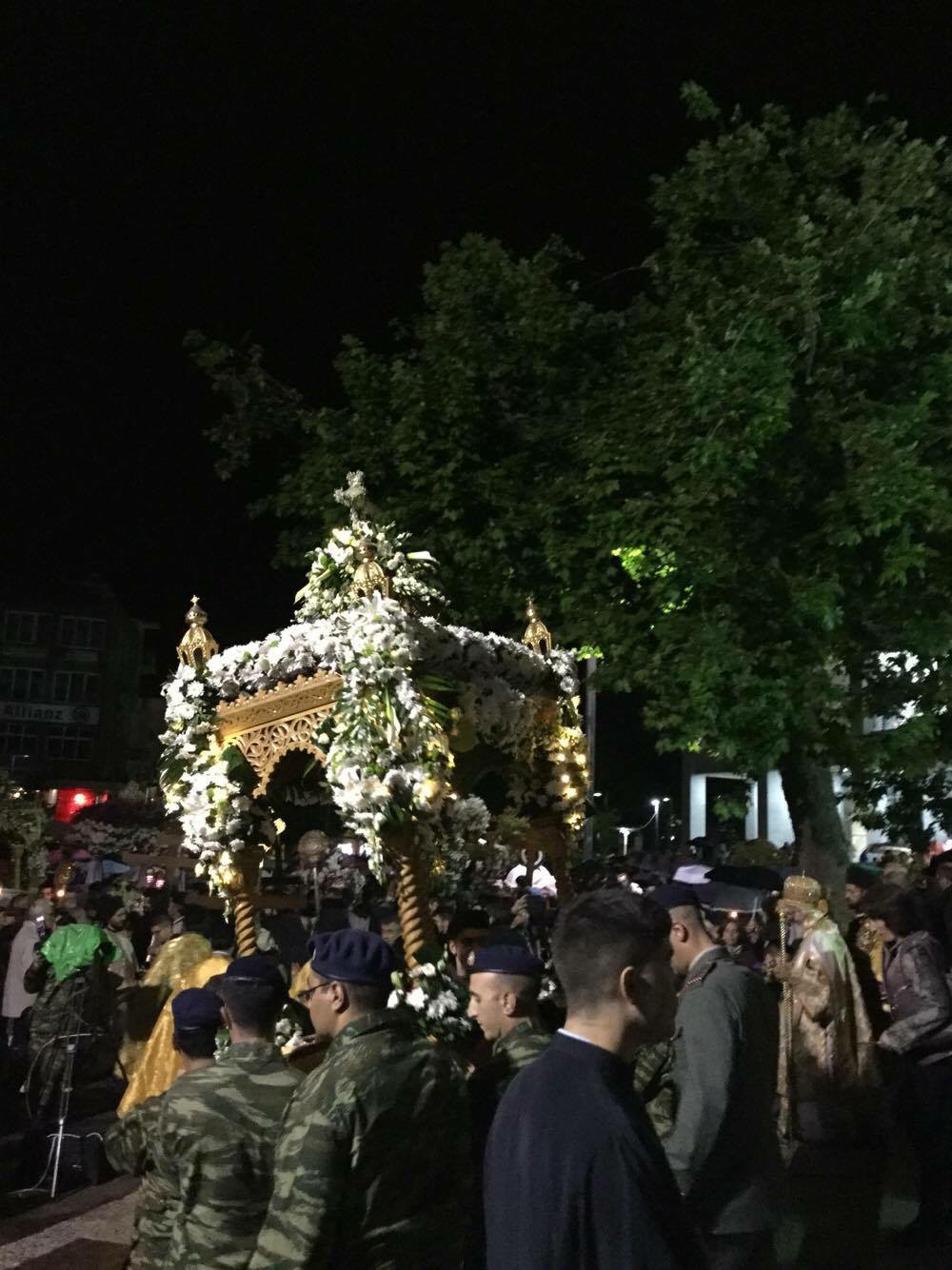 We arrived at the Church just before the procession started, the inside was packed with people and the smell of candles and incense was breathtaking. The sung service was very moving and towards the end men were chosen to carry the flower decorated plinth through a packed Church out into the tiny narrow streets. I was lucky in that I had a Greek friend to explain it all to me, the plinth was going to be carried down the hill to the main town square. The mournful music of the brass band and the procession of priests and people really did make it feel like a funeral but what I did not expect was the sight before us when we reached the Square,