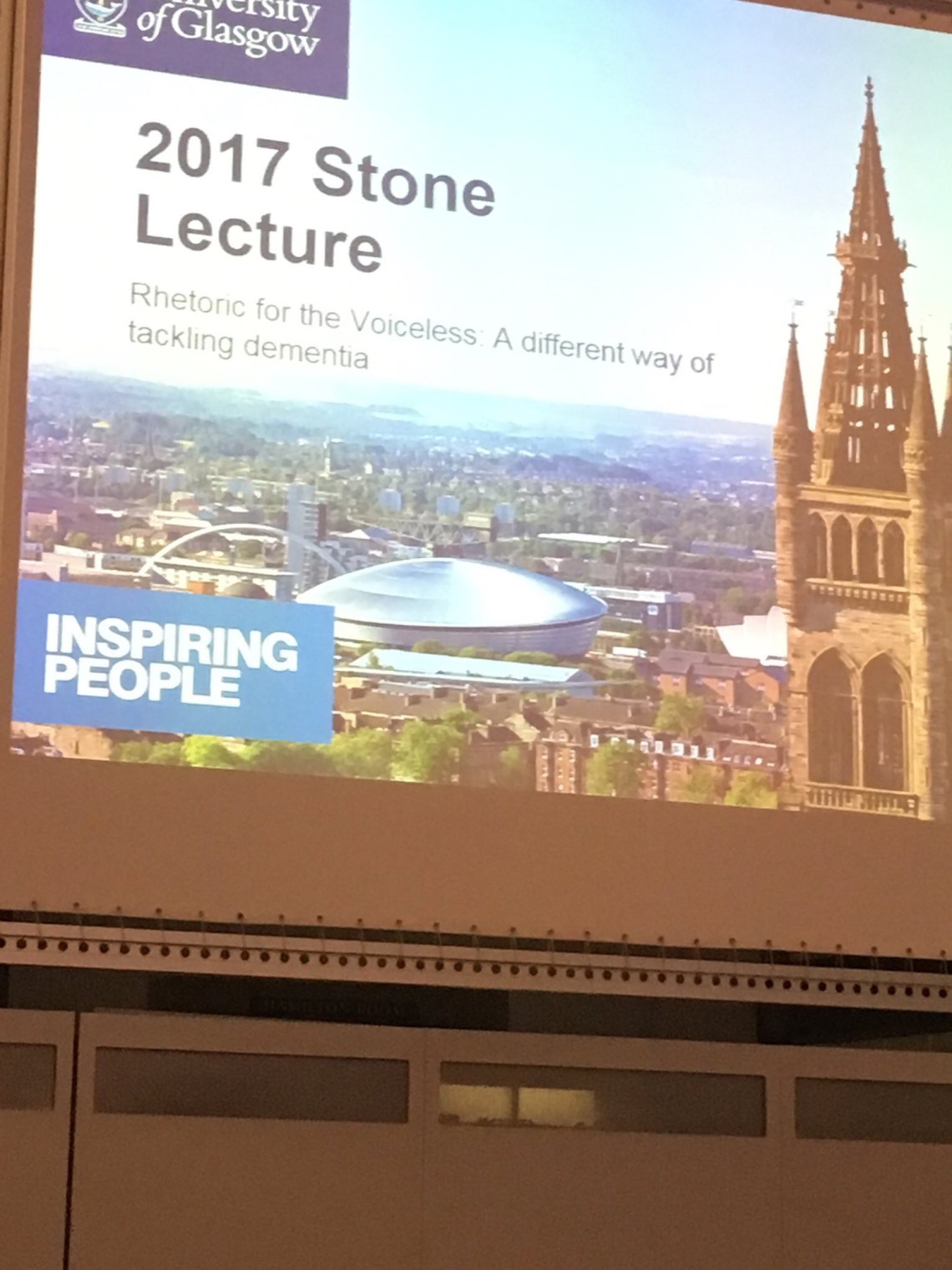I was privileged to attend the 2017 Stone Lecture at Glasgow University tonight. It was given by Sally Magnusson the writer and broadcaster, and more recently the founder of Playlist for Life. This is an amazing charity who do fantastic work with those who have dementia and their families. They use music as therapy to help communication and as a way for families to help cope with the difficult times.